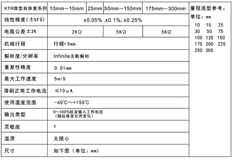KTR系列外置彈簧自復位式電阻尺的選型及技術參數: