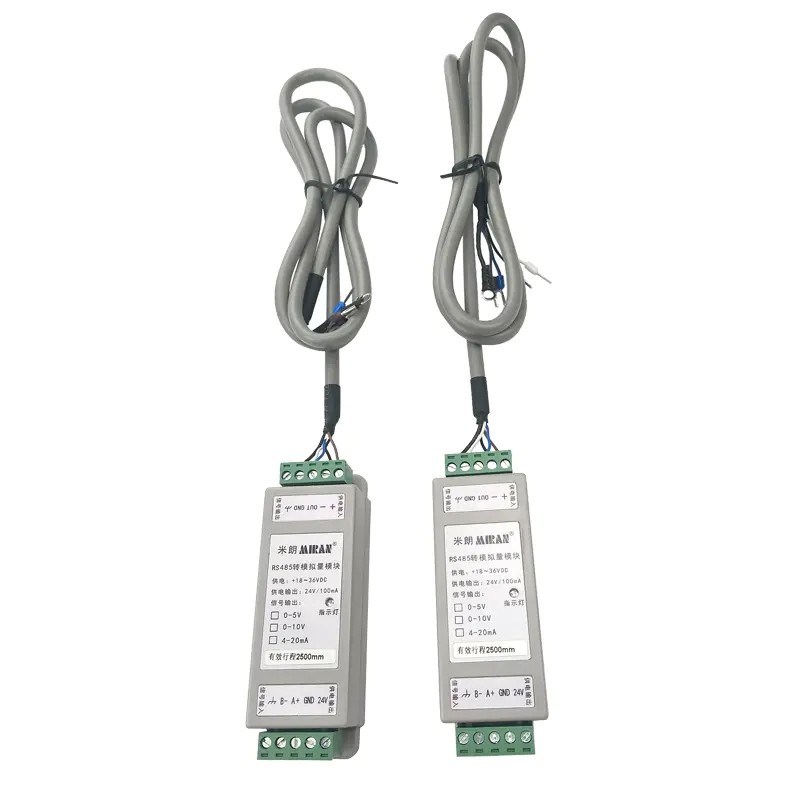 米朗數字模擬轉換模塊是配合米朗磁致伸縮位移傳感器等RS485數字信號輸出的產品使用。傳感器把實時位移信號用RS485數字信號格式傳送到安裝在電控箱內的該模塊進行解碼。然后轉化成0-10V電壓等模擬量信號,再傳送到控制器的標準模擬輸入。