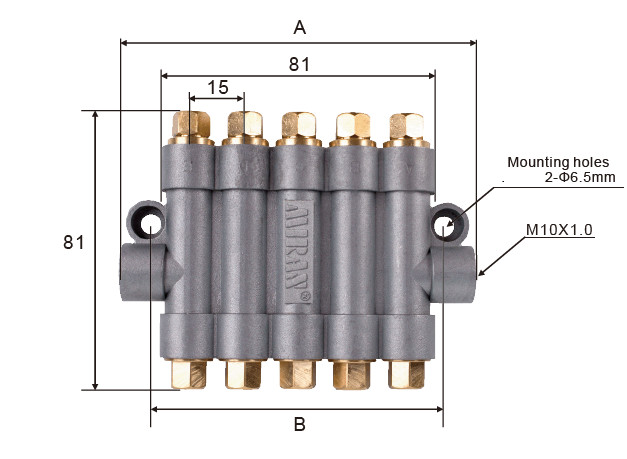 工作原理 A:計量活塞動作行程 B :傘形雙向閥動作行程見上圖,從潤滑泵壓送的油從主管A注入,并將傘形雙向閥B向推開流入,通過通路C壓送活塞室到F內。受壓力油作用下計量活塞向下動作彈簧G被壓縮蓄油,從而進行計量蓄油,當主管A內油壓被釋放〈即卸壓〉,傘形閥B因壓力差而動作,同時開啟吐出口E,于是活室內計量蓄油通過吐出口E送入油管H而將油輸送到潤滑點, 信號銷I當計量蓄油時突出.而供油給潤滑點時縮回,從而確認分配動作完成情況。 A: metering piston action schedule B: the action trip of the umbrella type two-way valve is shown in the figure above. The oil from the lubrication pump is injectedfrom the director A, and the umbrella-type two-way valve B is pushed open. Push the piston chamber to F through the channel C.The piston moves downward under the action of pressure oil.The spring G is compressed.Thus the measurement of oil storage.When the oil pressure is released in charge of A(the discharge pressure). The umbrella valve B moves with pressure difference. At the same time, it opens the outlet E, so the living room measures the oil storage.The oil is transported to the lubrication point by outlet E to the pipe H, and the signal pin I is prominent when measuring the oil storage. When the oil is supplied to the lubrication point, it is retracted to confirm the completion of the distribution.