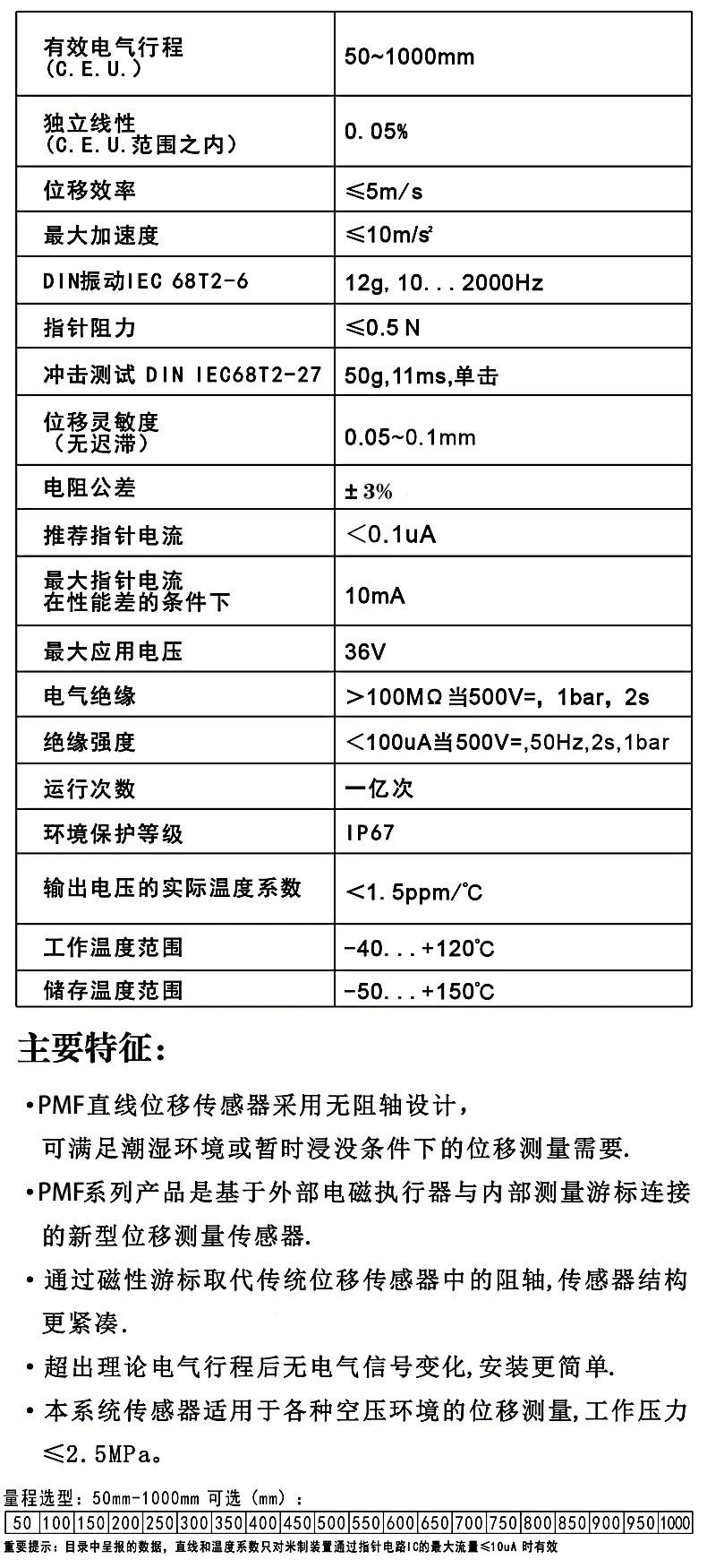 PMF滑塊磁阻式位移傳感器技術參數(shù)及主要特征: