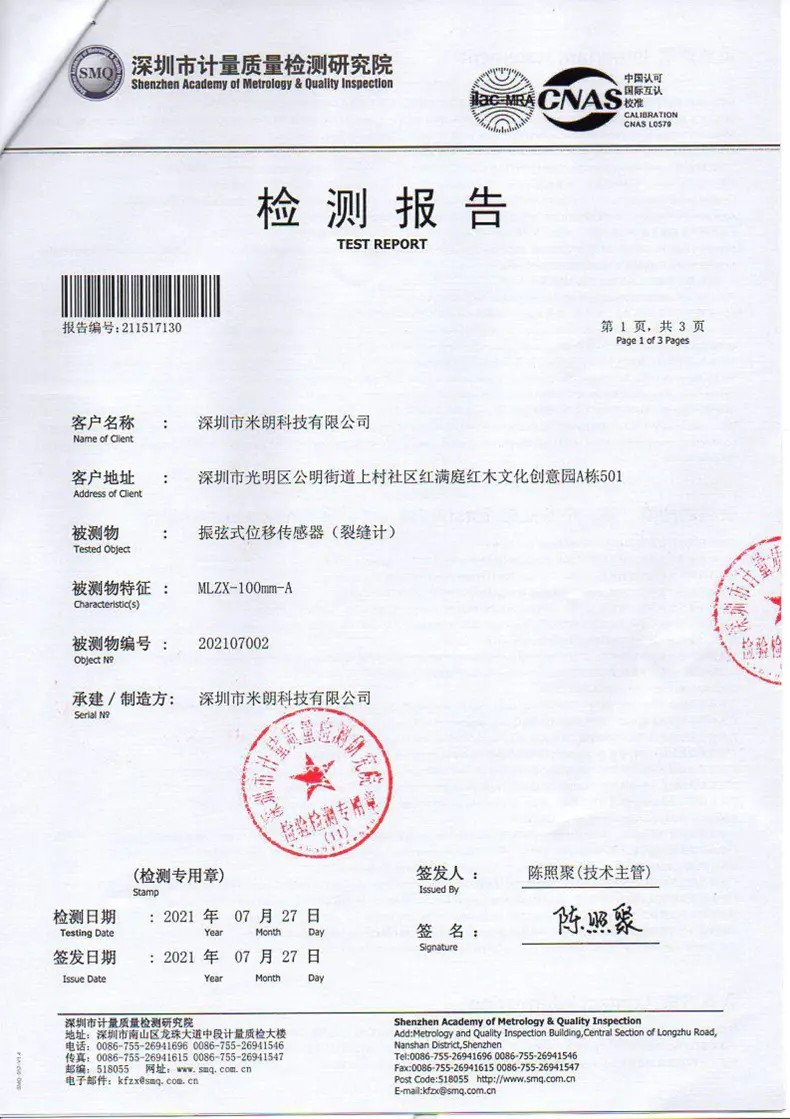 七、振弦式位移傳感器(裂縫計)檢測報告: