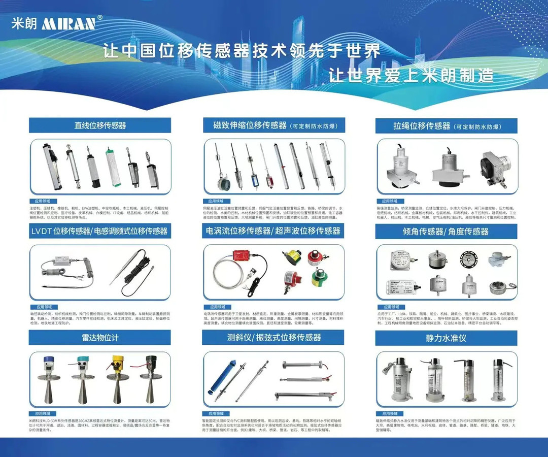 米朗科技這次展出的產品有:“MIRAN米朗、LinecSKI萊茵”系列電子尺/位移傳感器、磁致伸縮位移/液位傳感器、拉繩/線式位移傳感器、LVDT差動變壓位移傳感器、電渦流位移傳感器、磁柵尺、傾角傳感器、角度傳感器、超聲波位移傳感器、測斜儀及測斜管、壓力傳感器、裂縫計、振弦式位移傳感器、配套顯示控制器、靜力水準儀、雷達物位計、輪輻式稱重傳感器等,集中潤滑油泵及相關油路配件等產品。