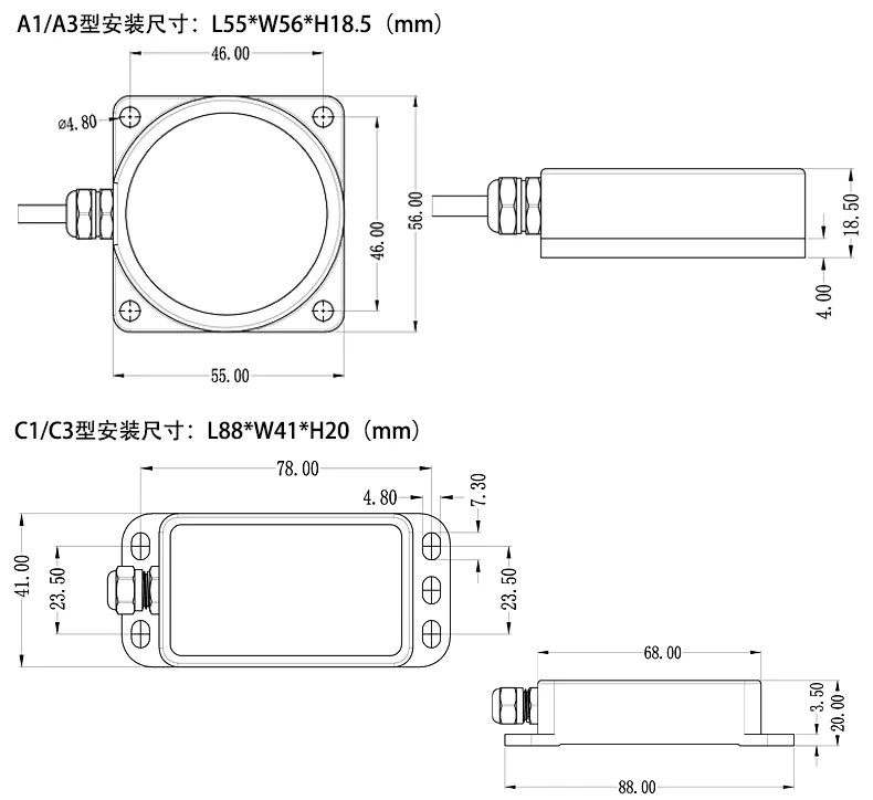 四、六軸(姿態(tài))傾角(動(dòng)態(tài))傳感器安裝尺寸: