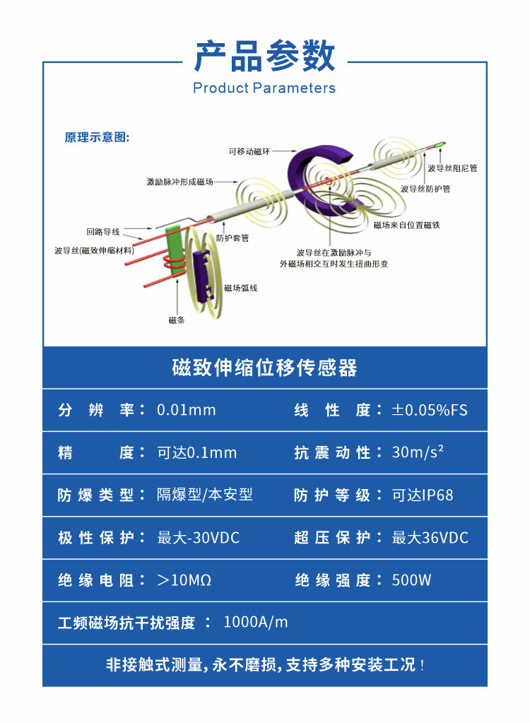 線性度:±0.05%FS,分辨率:0.01mm,精度可達(dá)0.1mm,抗震動(dòng)性30m/s2,工頻磁場(chǎng)抗干擾強(qiáng)度1000A/m,防護(hù)等級(jí)可達(dá)IP68,非接觸式測(cè)量,永不磨損,支持多種安裝工況!