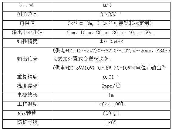 MZK-(6mm-50mm)中空軸角度傳感器技術(shù)參數(shù):